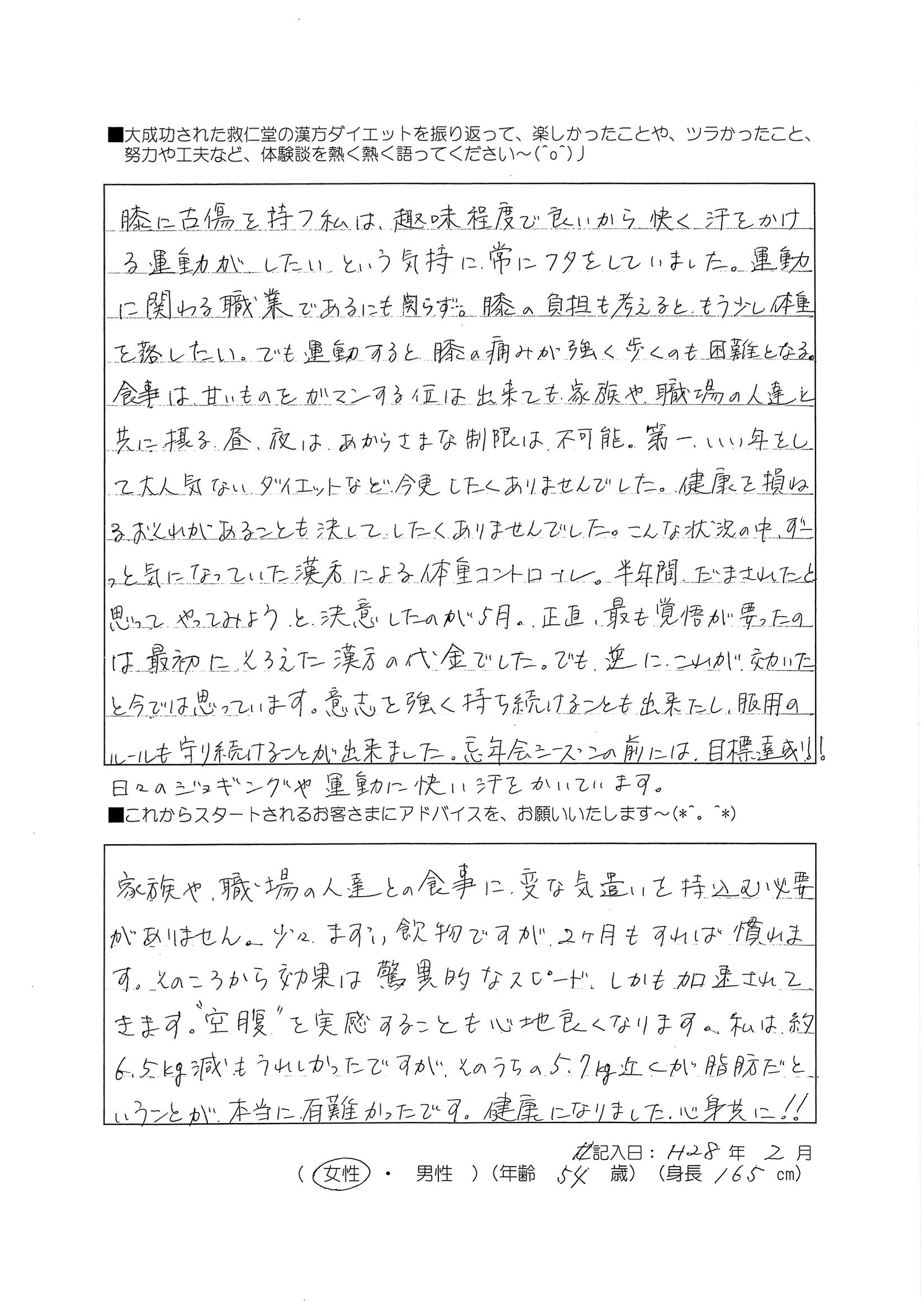 2016年2月 54歳165cm 女性のお客様です